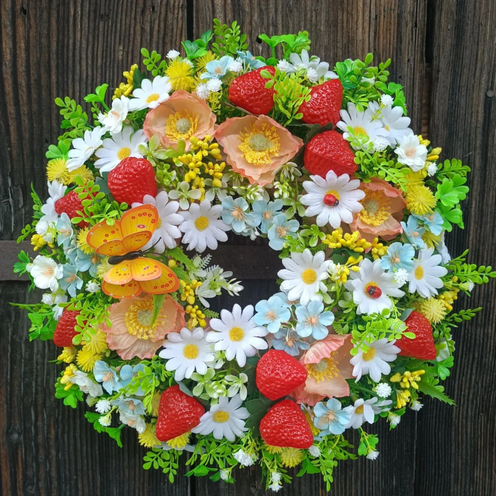 Dekorativní jarní věneček s kvítky. Věnec je námi ručně vyrobený z umělých květin a materiálů. Dominantou věnečku je krasný motýl.