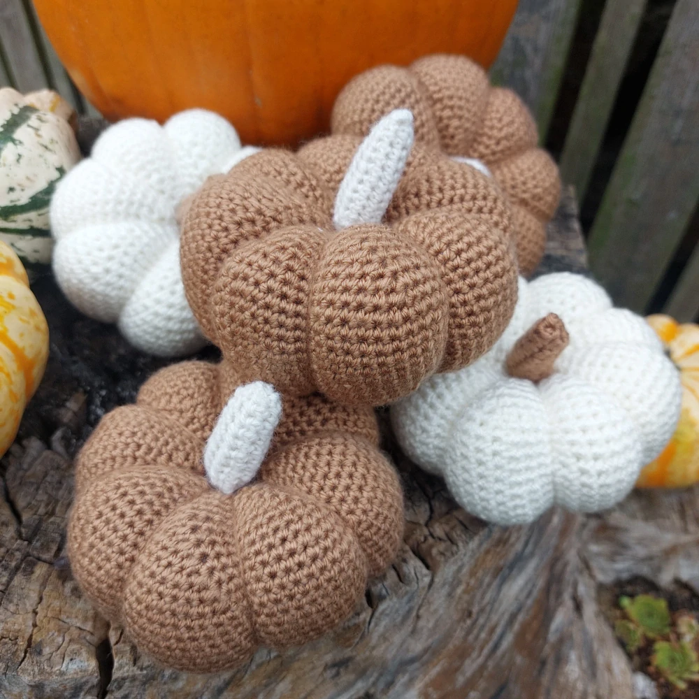 Dekorativní námi ručně vyrobená háčkovaná dýně ve dvou barevných provedeních.