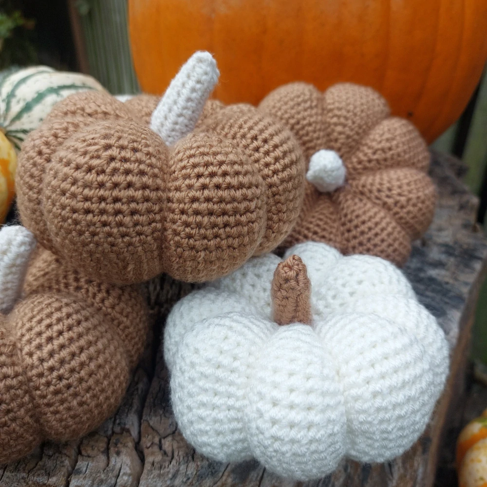 Dekorativní námi ručně vyrobená háčkovaná dýně ve dvou barevných provedeních.