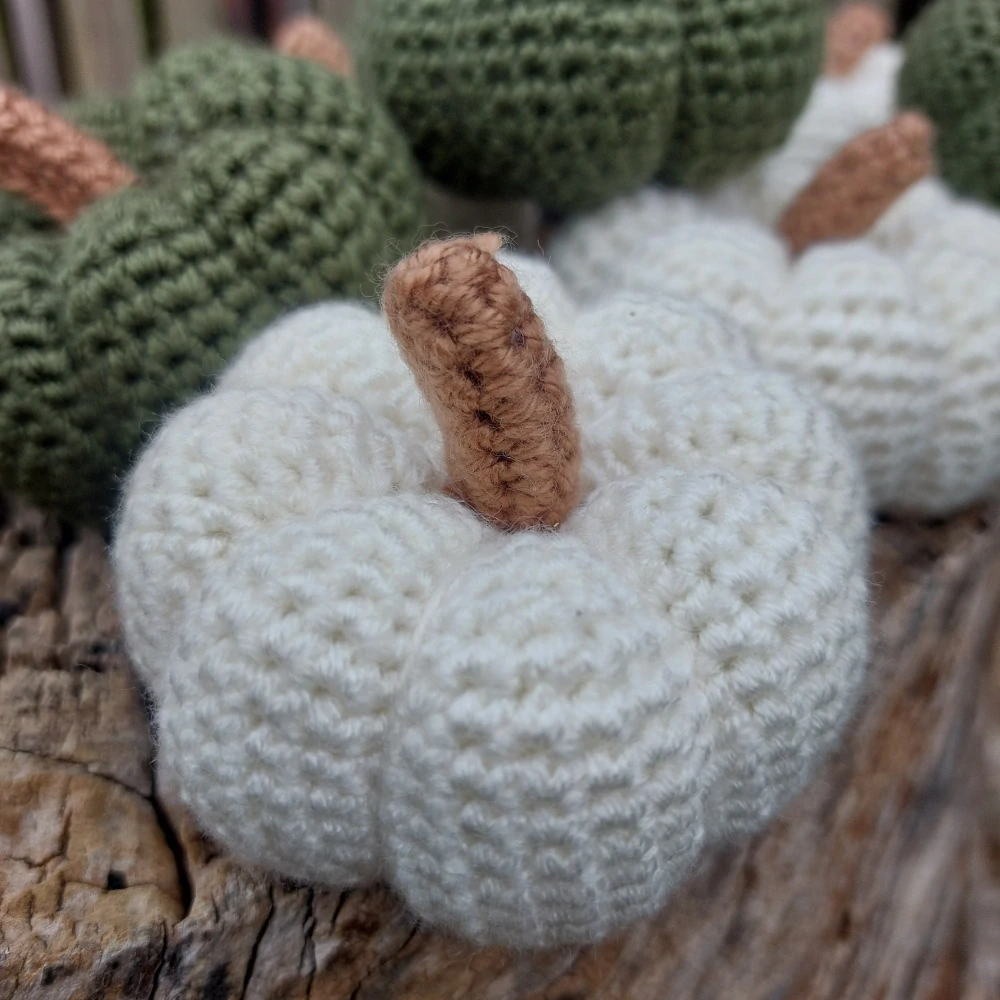 Dekorativní námi ručně vyrobená háčkovaná dýně ve dvou barevných variantách.