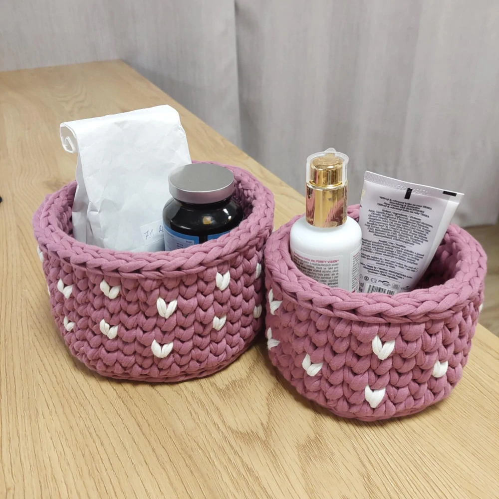 Dekorativní námi ručně uháčkované košíky. Košíky jsou v tmavě růžové barvě s bílými srdíčky. Perfektní na organizování do koupelny, k toaletnímu stolku, k přebalovacímu pultu, ale i do poliček. Set obsahuje 2 velikosti košíků.