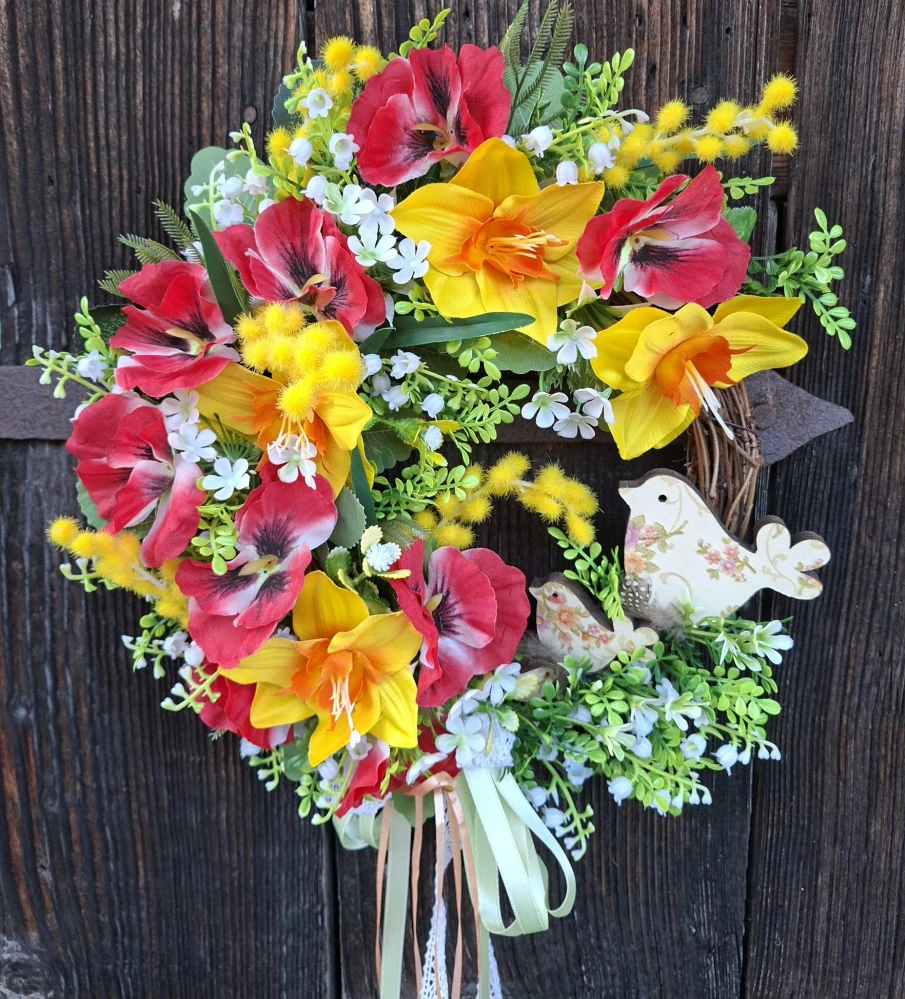 Dekorativní krásný jarní věneček. Věnec je s maceškami, narciskami a konvalinkami. Věneček má proutěný korpus. Na prave straně jsou dřevěné ptáčci. Věnec je námi ručně vyrobený.