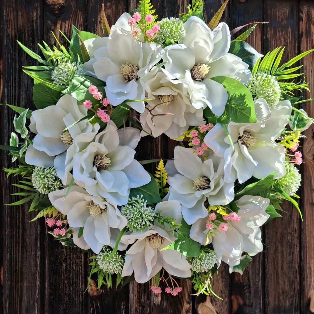 Dekorativní krásný jarní věneček. Věnec je ozdobený magnoliemi .Věnec je námi ručně vyrobený.