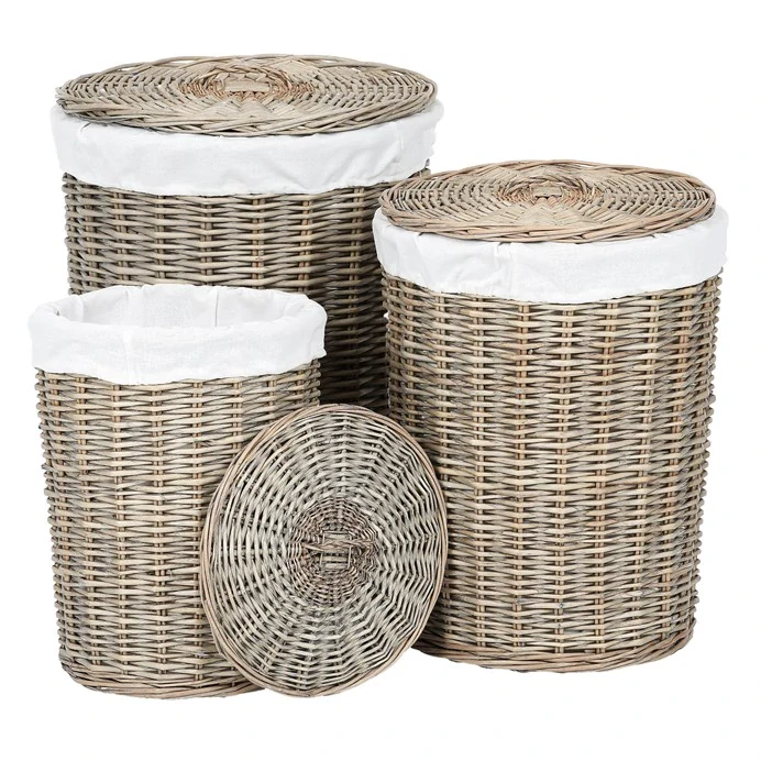 Proutěný prádelní koš. Koš má kulatý tvar a je opatřený bílou látkou. Součástí koše je i proutěné víko s úchytkou.