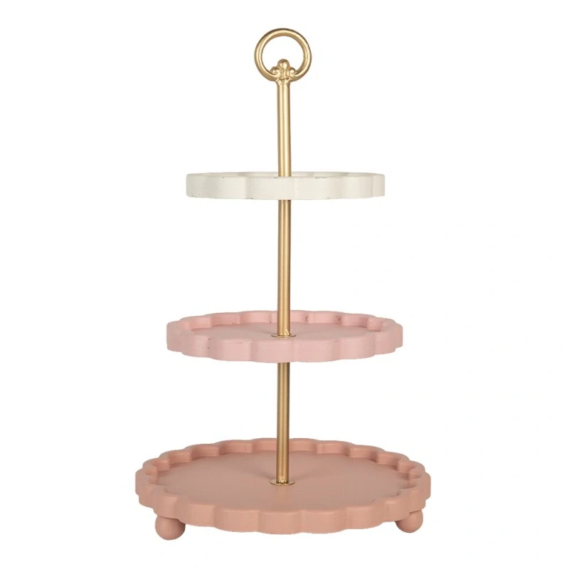 Dekorativní kovový třípatrový etažér. Etažér má dva odstíny růžové a bílé. Držák je zlatý se zdobením. Perfektní na sváteční tabuli, ušetří místo na stole.