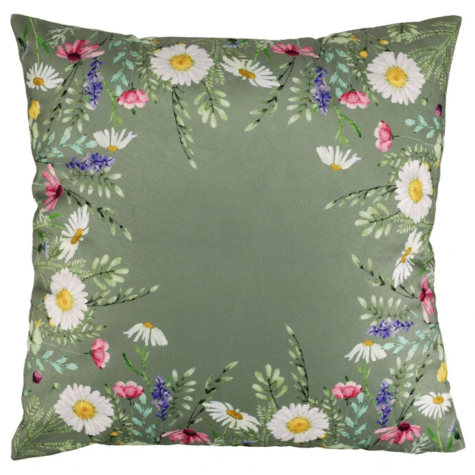 Dekorativní krásný polštář. Polštář je v zelené barvě, zdobený lučním kvítím. Má sametový povrch. Perfektní na jarní ozdobení sedačky či křesla.