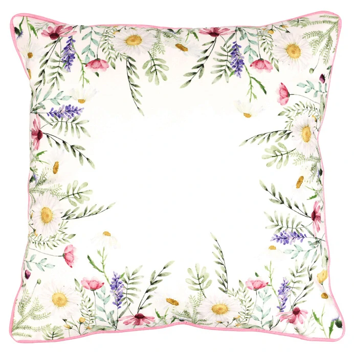 Dekorativní krásný polštář. Polštář je v bílé barvě, zdobený lučním kvítím. Má sametový povrch. Perfektní na jarní ozdobení sedačky či křesla.
