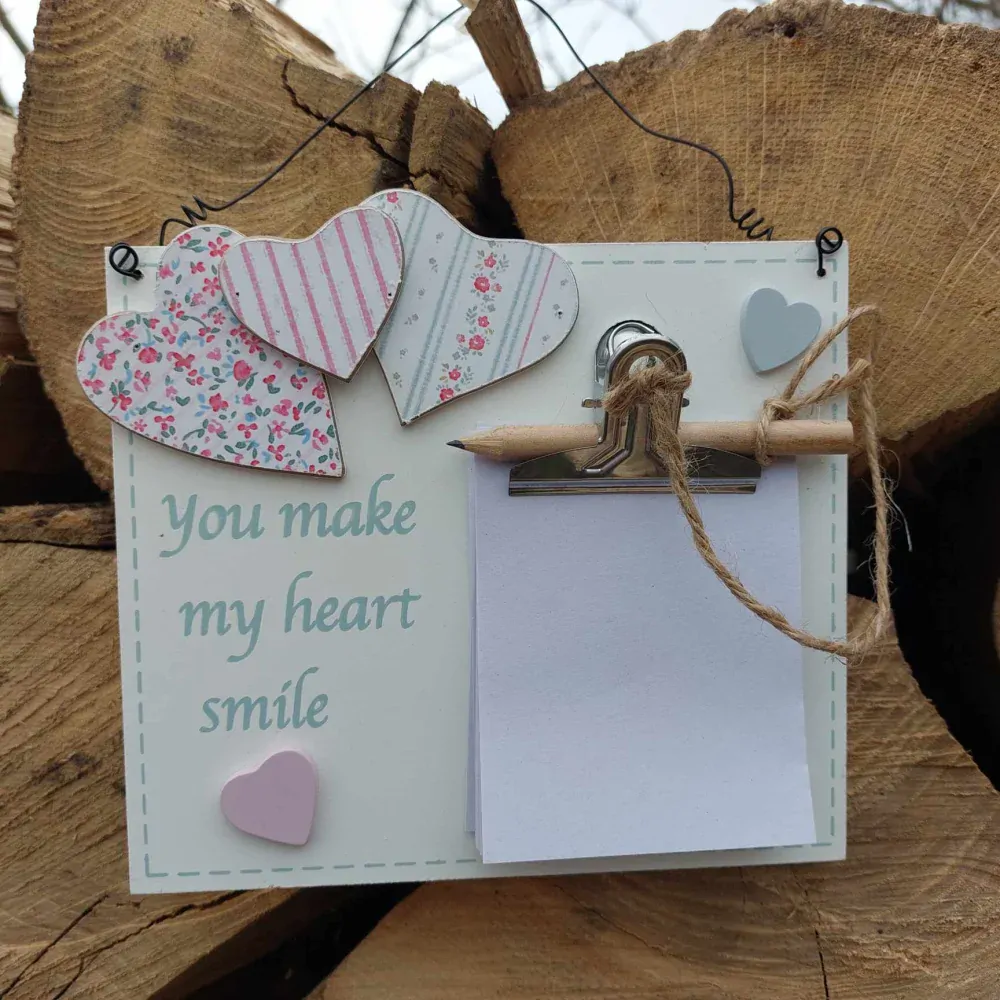 Dekoratvní dřevěná tabulka na pověšení. Tabulka je zdobená nápisem a srdíčky. Součástí dekorace jsou papírky na klipu a obyčejná tužka.