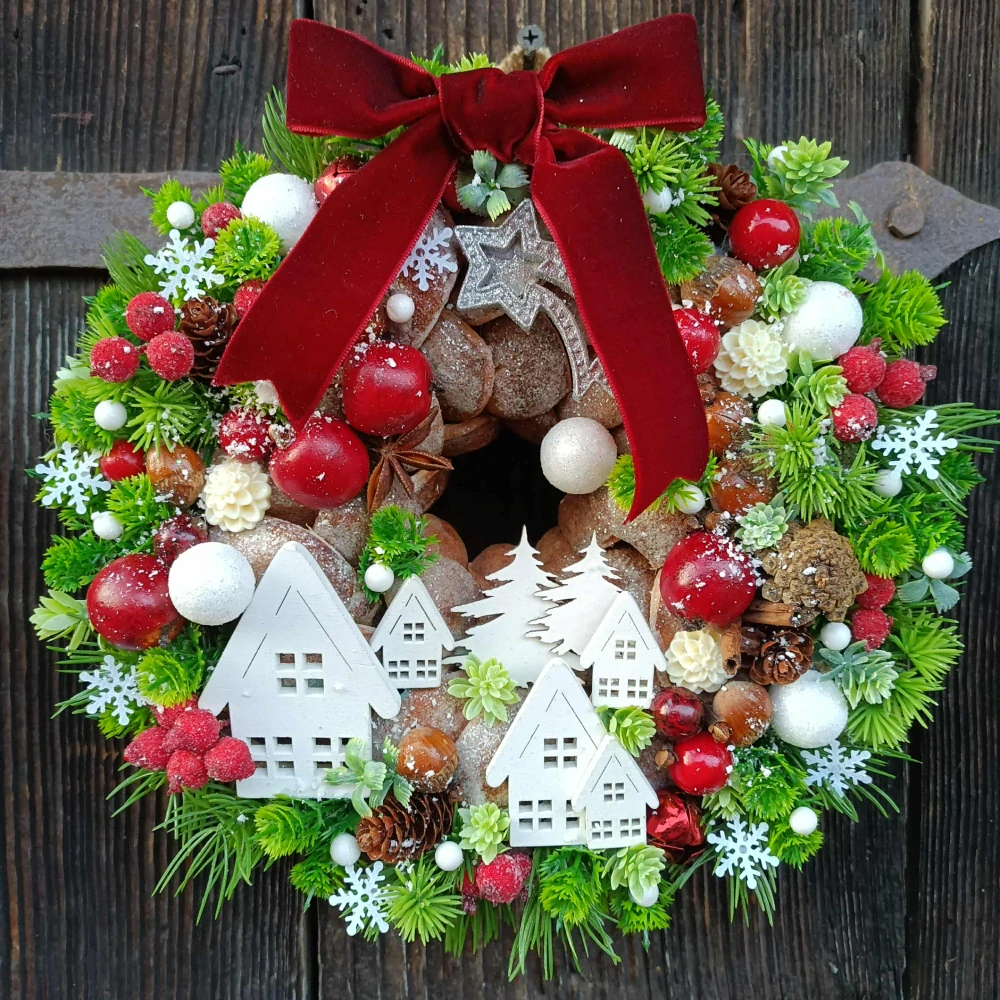 Dekorativní vánoční věnec, ručně vyráběný! Věnec zdobí mnoho různých dekorací - koule, oříšky, jablíčka a další s vánocemi spojené dekorace. Dominantou věnečku jsou domečky, stromky a kometa. Ideální krásná vánoční dekorace na dveře.