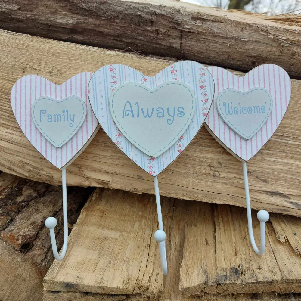 Dekorativní dřevěný věšáček ve tvaru srdcí. Věšák má tři kovové háčky. Vzadu jsou dvě skobičky pro snadné pověšení. Hodí se na klíče, utěrky nebo na šperky.